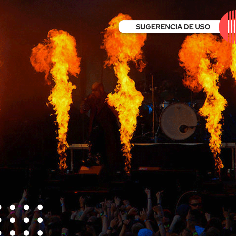 Sistema de llama impulsado por fluido de alta precisión que permite ráfagas de rápidas y precisas. Tiene un alcance de hasta 1 a 3 metros, es controlado por la consola DMX o el sistema de disparo de fuegos artificiales.